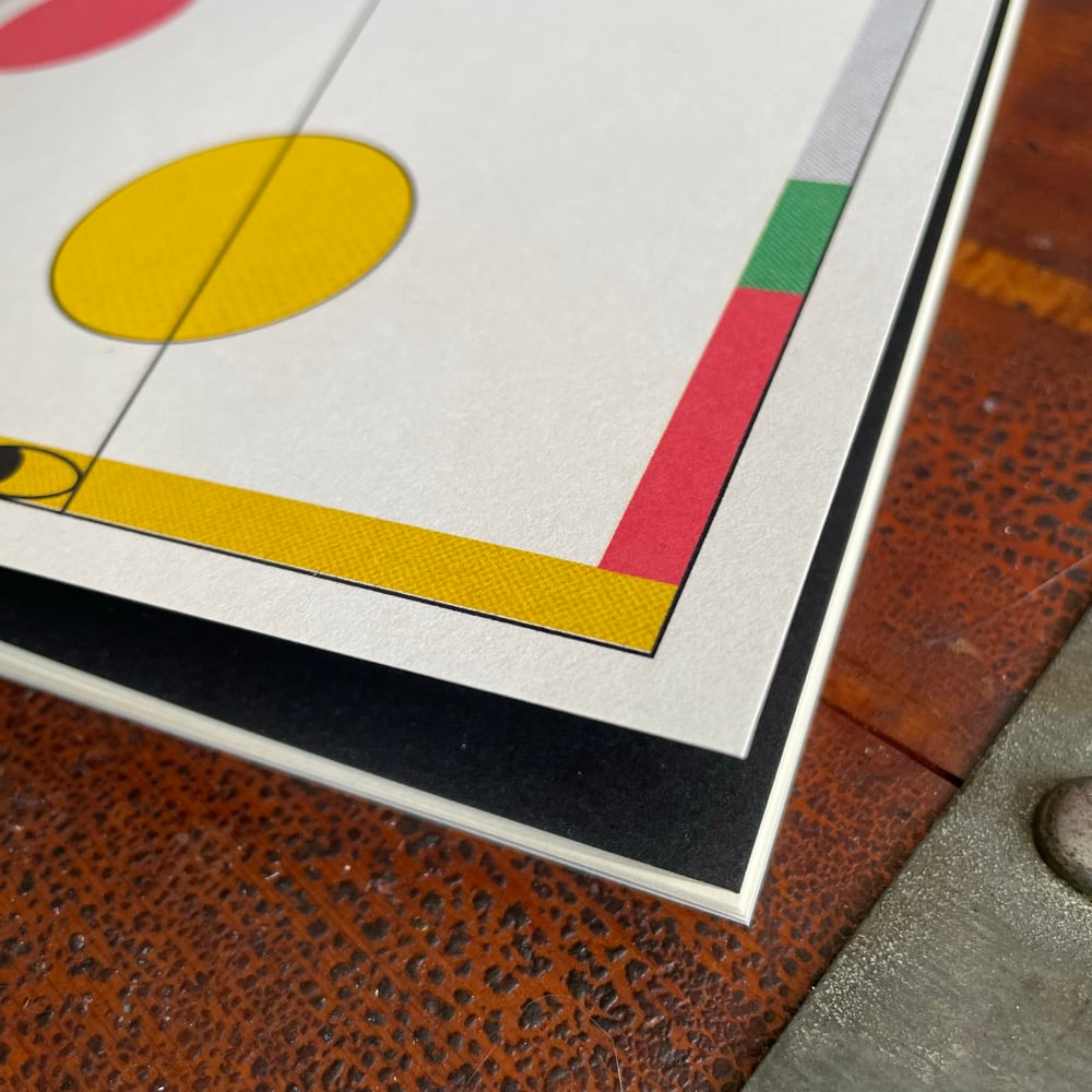 8" x 7" staple bound chapbook printed in a limited hand-numbered print run of 100 copies. Printed on 28lb text and 100lb Grout Gray French paper, with 81lb black onyx Stardream endpapers. All orders ship with free pamphlets and stickers.